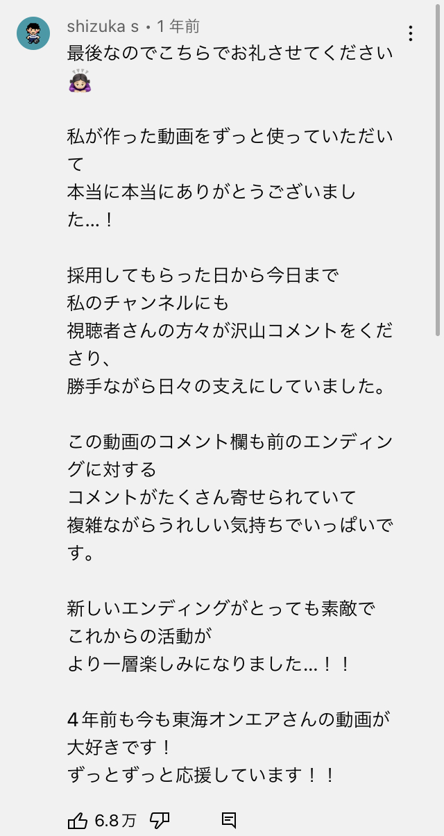 そして今はほとんどそのコメントは見られなくなりましたが、旧エンディングがいいというコメントはしばらく動画が出るたびに何人かの視聴者から上げられていました。